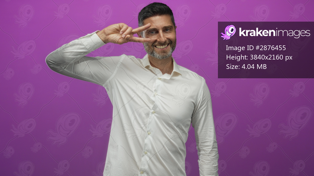 Man in white shirt and short beard making a peace sign with his hand and smiling in a studio with a purple backdrop; playful confidence.