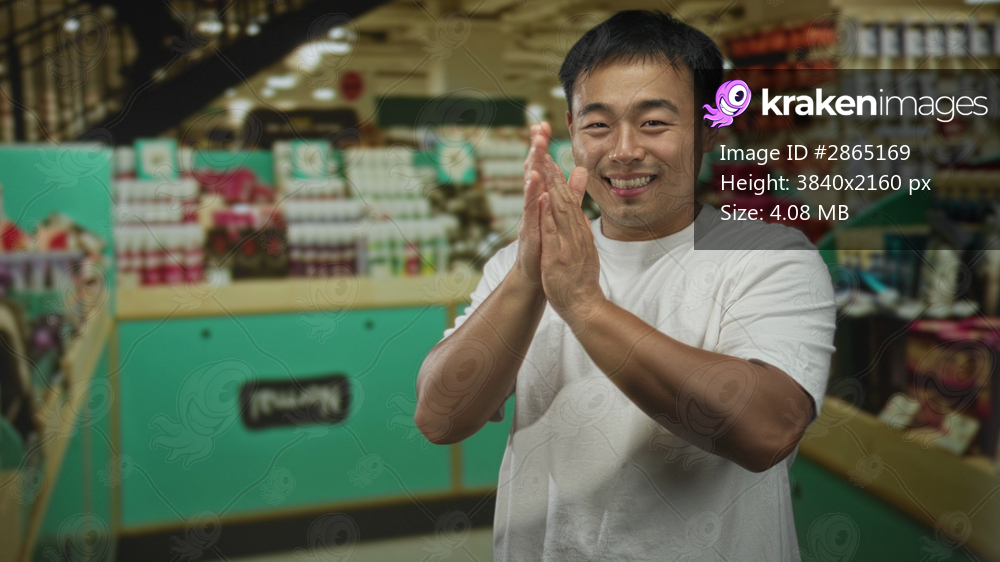 Man in white shirt smiles and claps bare hands next to stacked store shelves in brightly lit building; pure joy.
