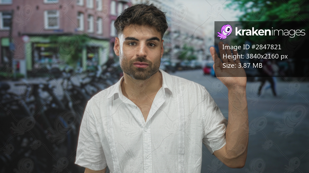 Man in white shirt with stubble raises right hand in a wave gesture on urban street lined with bicycles and brick buildings; friendliness.