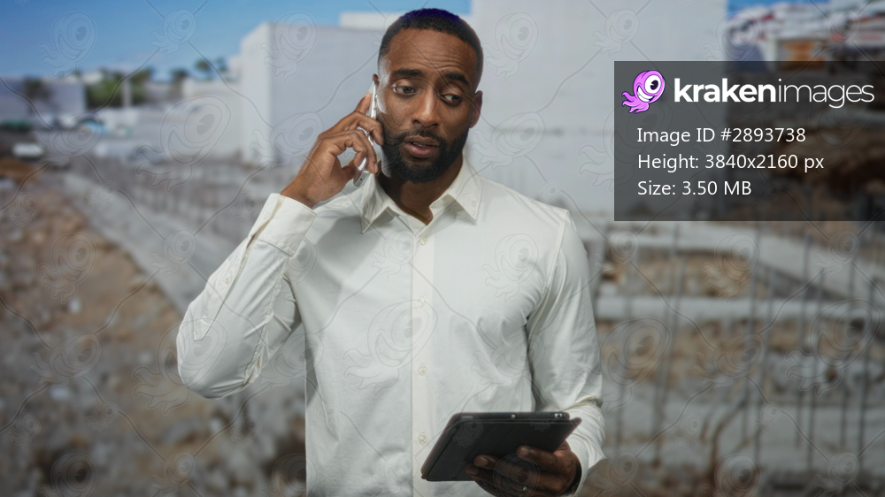 Man in white shirt talking on phone while holding tablet with right hand at building site outdoors, reviewing building plans and notes on screen; concentration planning. - Kraken Images