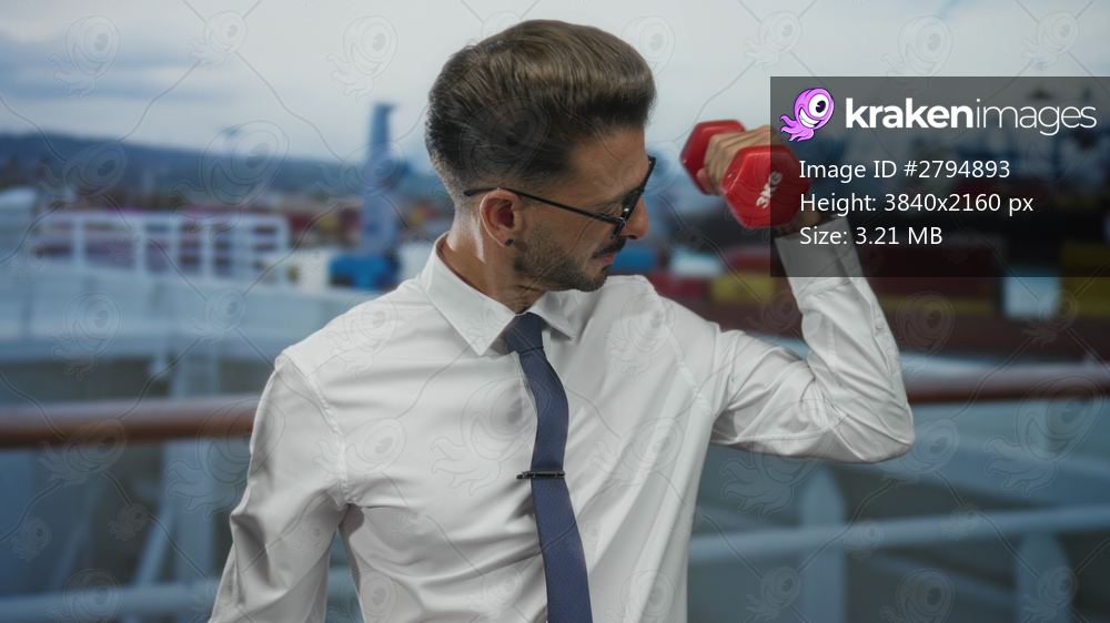 Man in white shirt and tie lifts red dumbbell on building deck with cargo ship containers in view; determination.