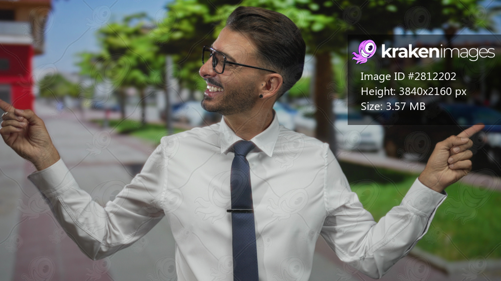 Man in white shirt and tie makes arms crossed x gesture with both index fingers pointing in opposite directions on a bustling city street; rejection.