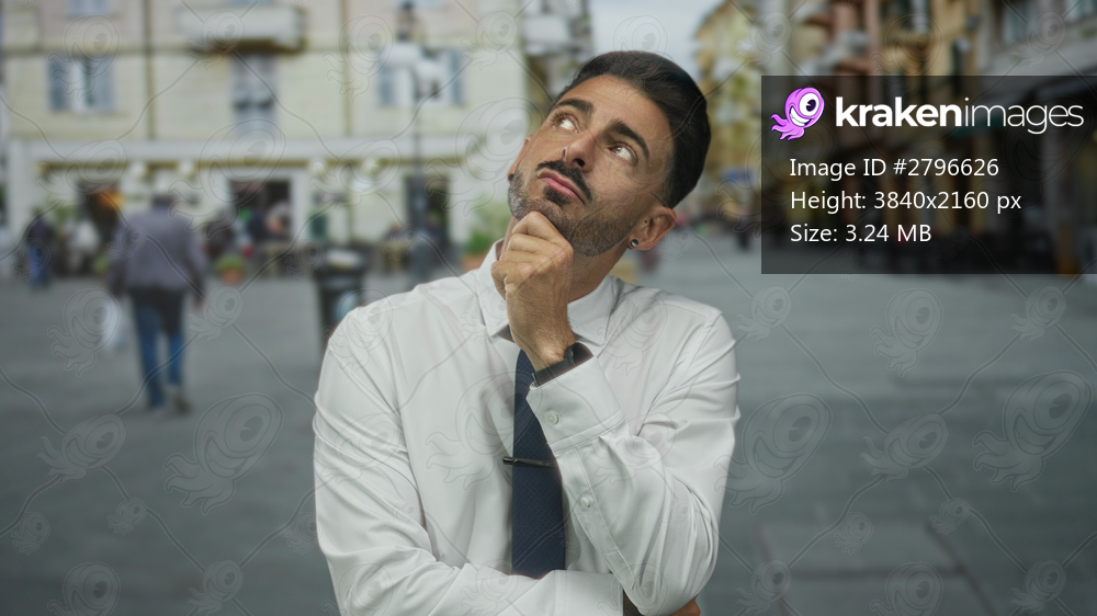 Man in white shirt and tie rests hand on chin on urban street lined with iconic historic buildings; doubt.