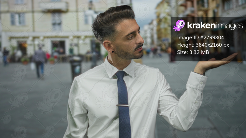Man in white shirt and tie rests hand on chin on urban street lined with iconic historic buildings; doubt.
