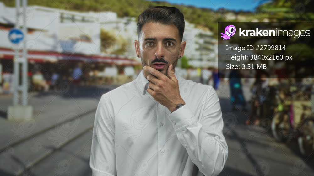 Man in white shirt touches chin in pensive gesture on street under bright sunlight with focused gaze and slight furrowed brow; reflection.