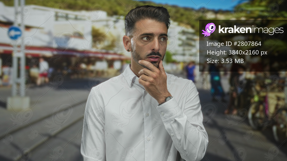 Man in white shirt touches chin in pensive gesture on street under bright sunlight with focused gaze and slight furrowed brow; reflection.
