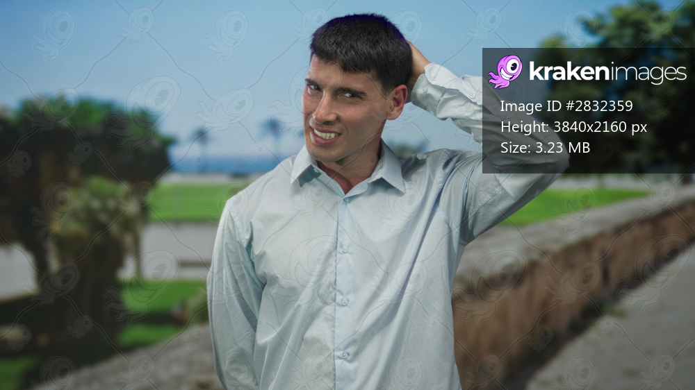 Man in white shirt touches forehead with hand in front of stone wall and trimmed hedges in green park on sunny day; stress.