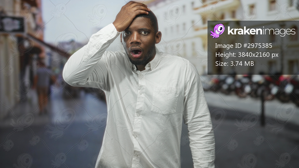 Man in white shirt touches forehead with hand on city street near parked motorcycles; surprise realization.