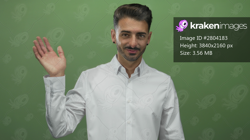 Man in white shirt waves bare hand and smiles in bright green studio; friendly welcome open communication.