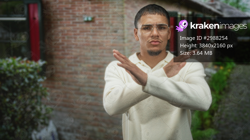 Man in white sweater with arms crossed x and clear glasses standing in front of brick building; defiance resolve.