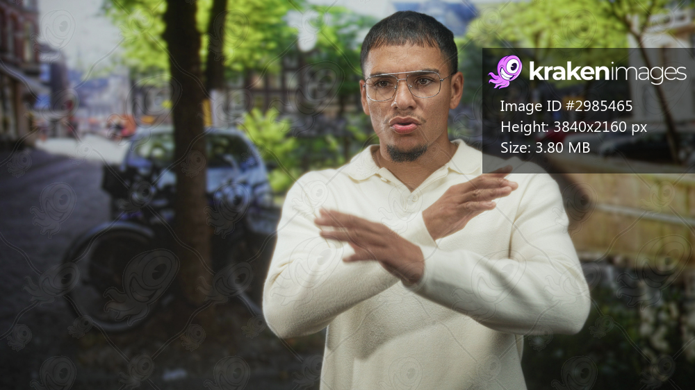 Man in white sweater and glasses crossing arms with hands visible on a cobblestone urban street beside canal and parked bicycles and cars; rejection protest. - Kraken Images
