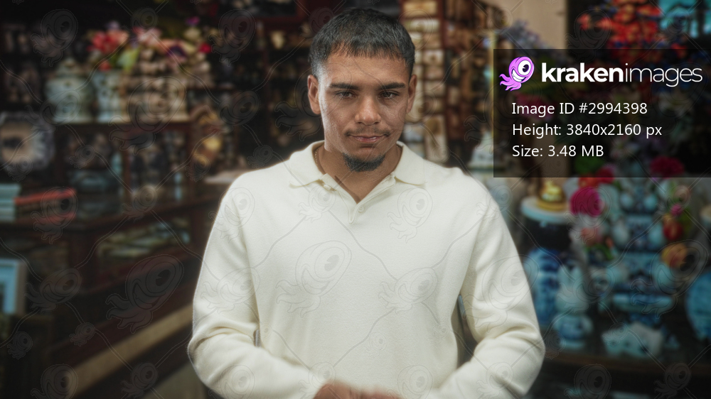 Man in white sweater with hands clasped and eyes closed amid porcelain vases and decorative ceramics in building; quiet contemplation.