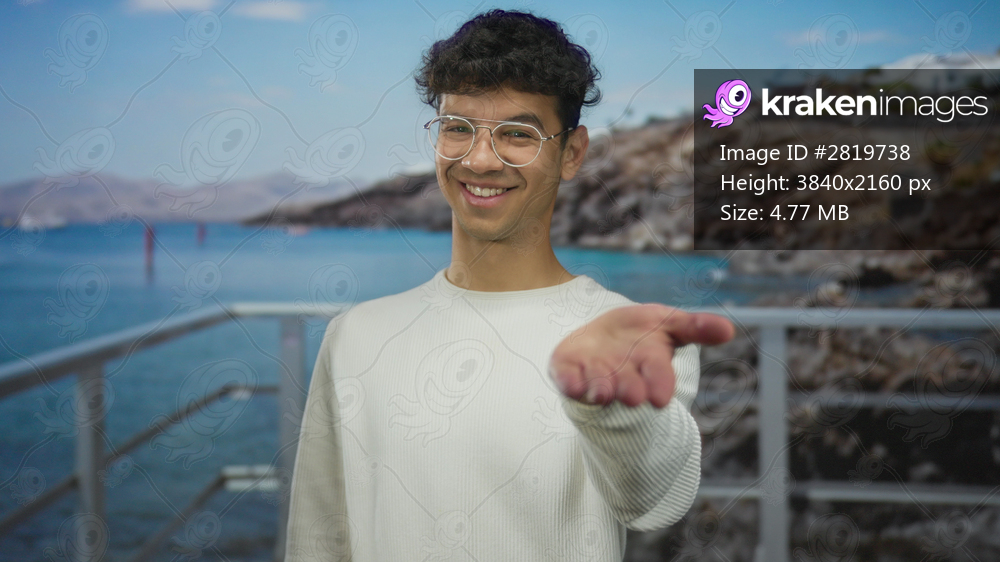Man in white sweater smiling gently offers palm up hand on sunny seaside pier railing; friendly invitation.