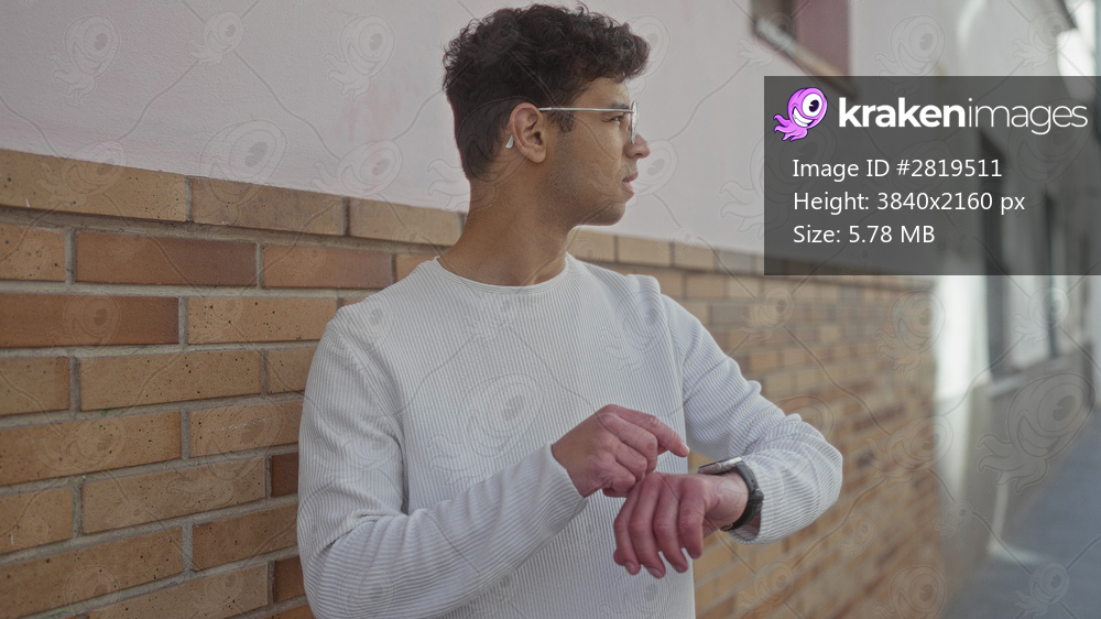 Man in white sweater wearing glasses with finger pointing to smartwatch on street under sunlight; punctuality.