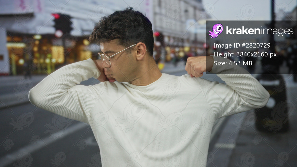 Man in white sweater wearing glasses flexes muscles and clenches fists on city street during daytime; confidence.