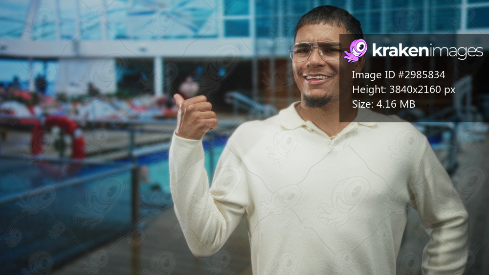 Man in white sweater wearing glasses and gold chain gives thumbs up by pool railing inside building; confidence friendliness.