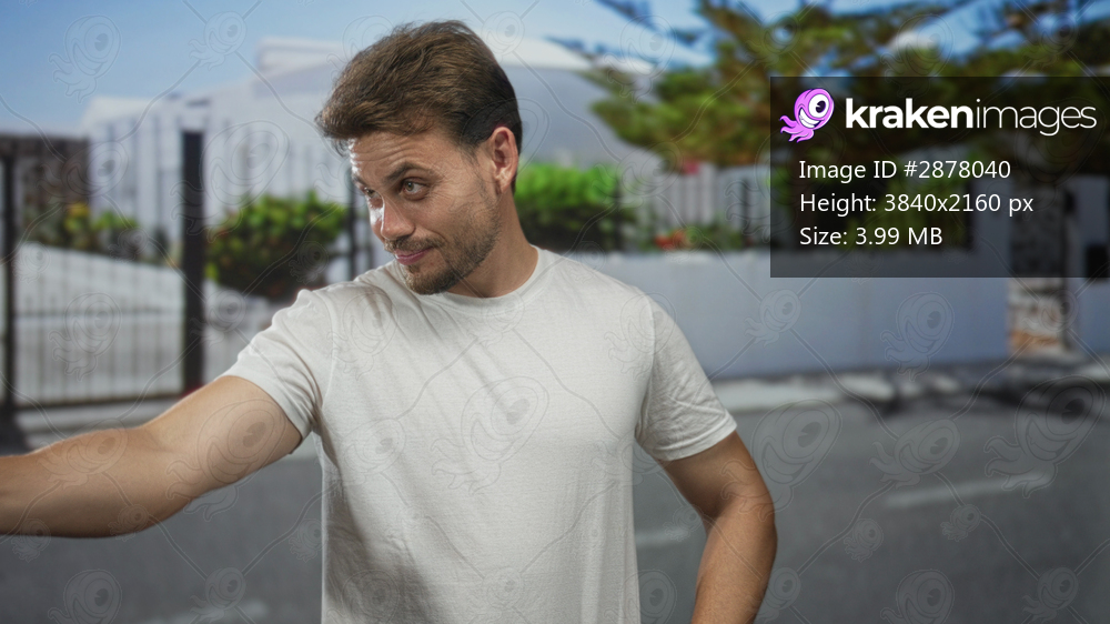 Man in white t shirt with bare arm extends hand for handshake on residential street; friendly welcome.