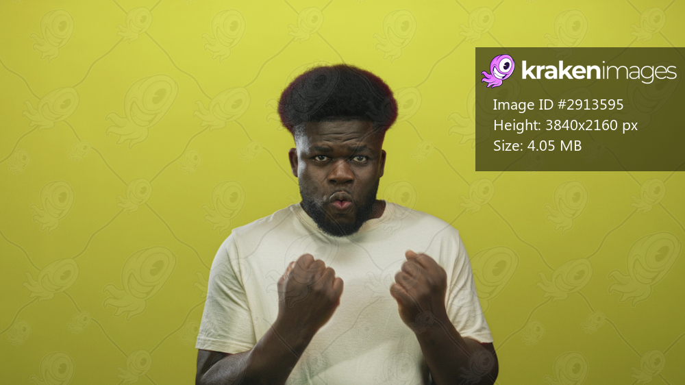 Man in white t shirt clenches fists toward camera in studio with yellow wall and intense facial expression; determination ambition.