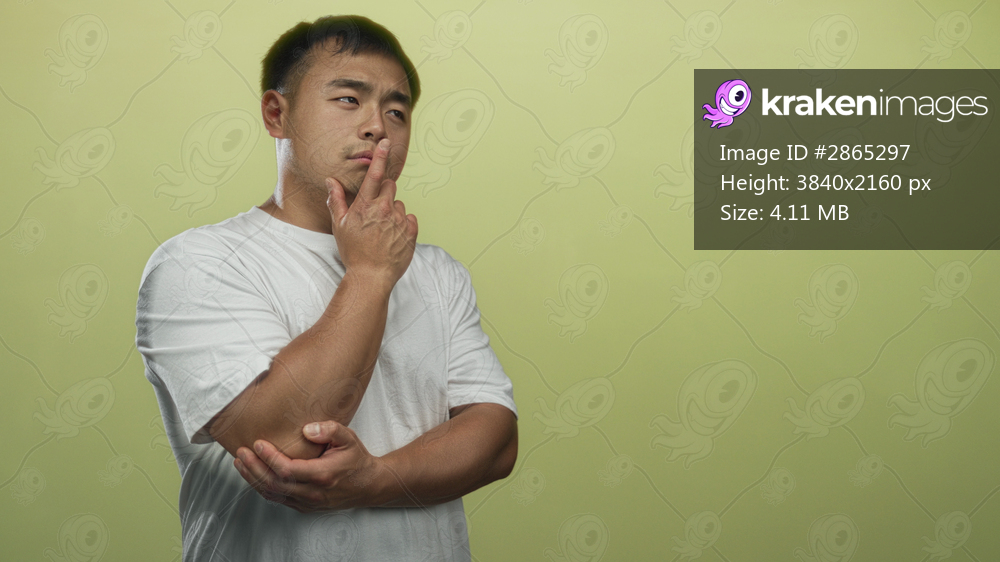 Man in white t shirt with finger to lips gesture in studio; quiet introspection contemplative solitude.