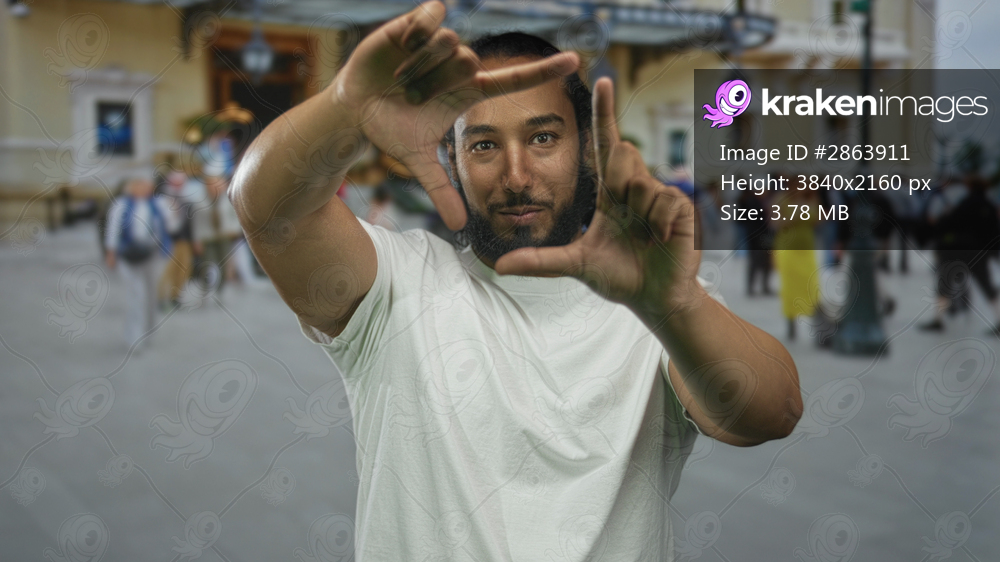 Man in white t shirt framing the view with hands and fingers while standing on a crowded street near a historic building facade; confidence creativity. - Kraken Images