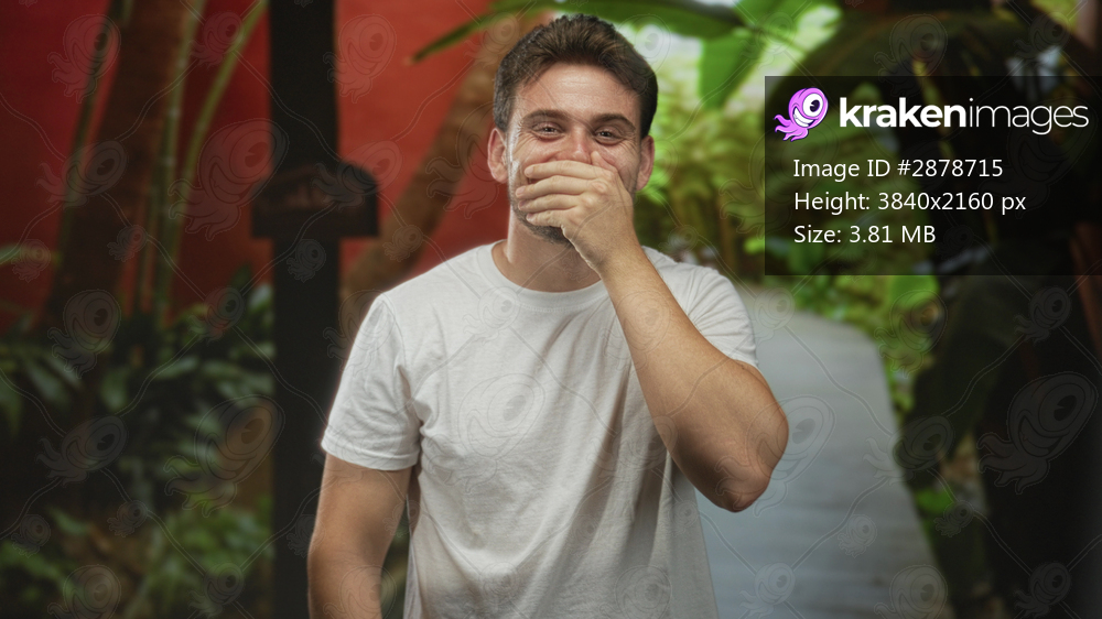 Man in white t shirt with hand covering mouth on a street walkway near plants, visible forearm and smile; amusement shyness.