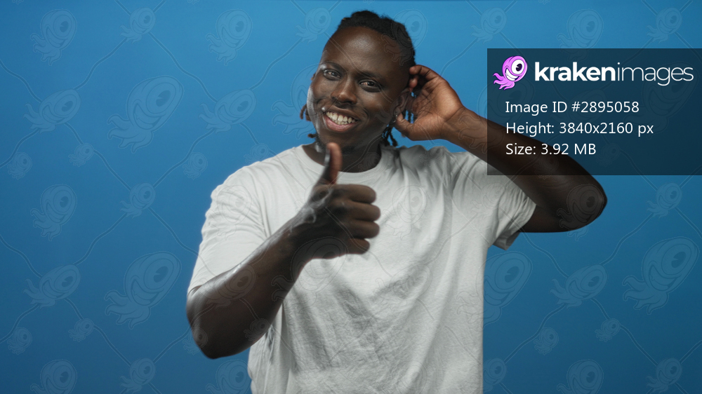 Man in white t shirt holding hand to ear and giving thumbs up in studio with solid blue backdrop; playful confidence.