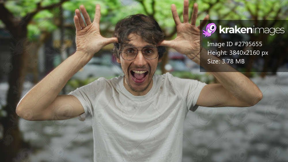 Man in white t shirt holding hands beside face in a green outdoor park smiling broadly at camera; playfulness.