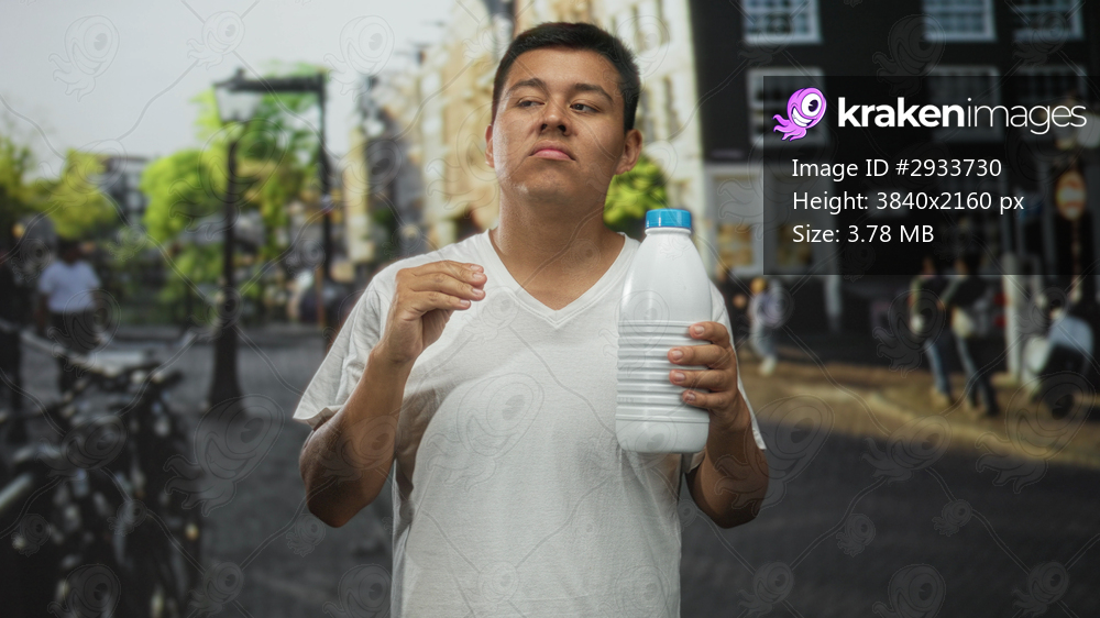 Man in white t shirt holding plastic milk bottle, right hand gripping the bottle and left hand raised with closed eyes on a city street; calm reflection. - Kraken Images