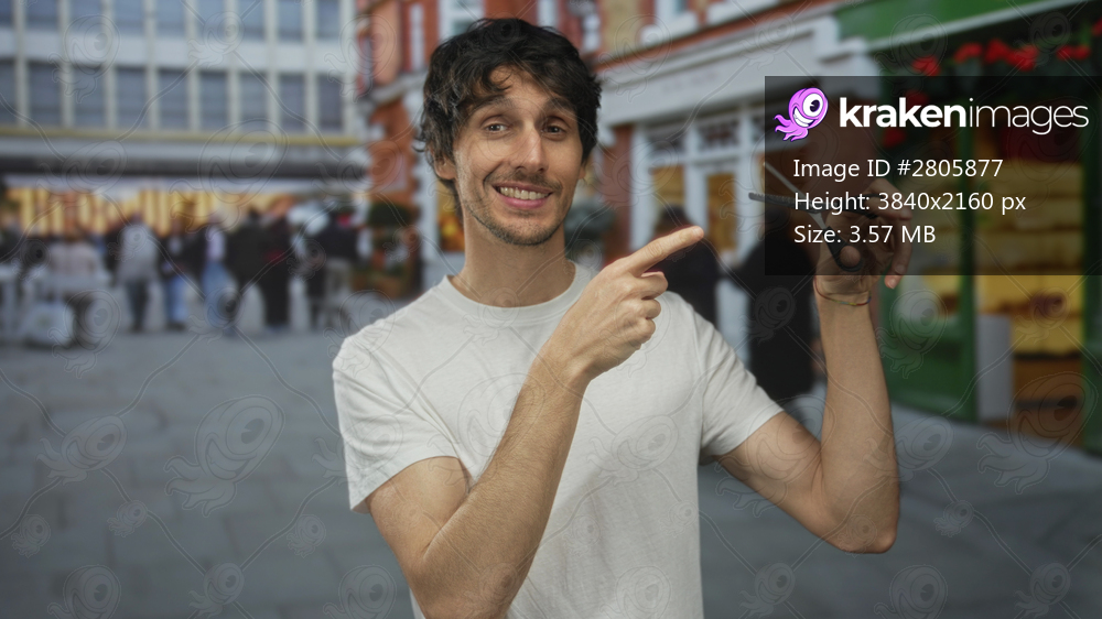 Man in white t shirt holds black scissors and points finger toward blade in urban street; decision making confidence.