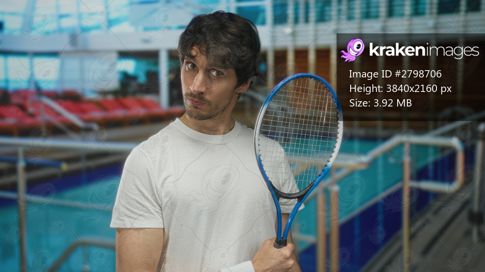 Man in white t shirt holds blue tennis racket inside cruise ship building, stares ahead with pensive gaze; contemplation.