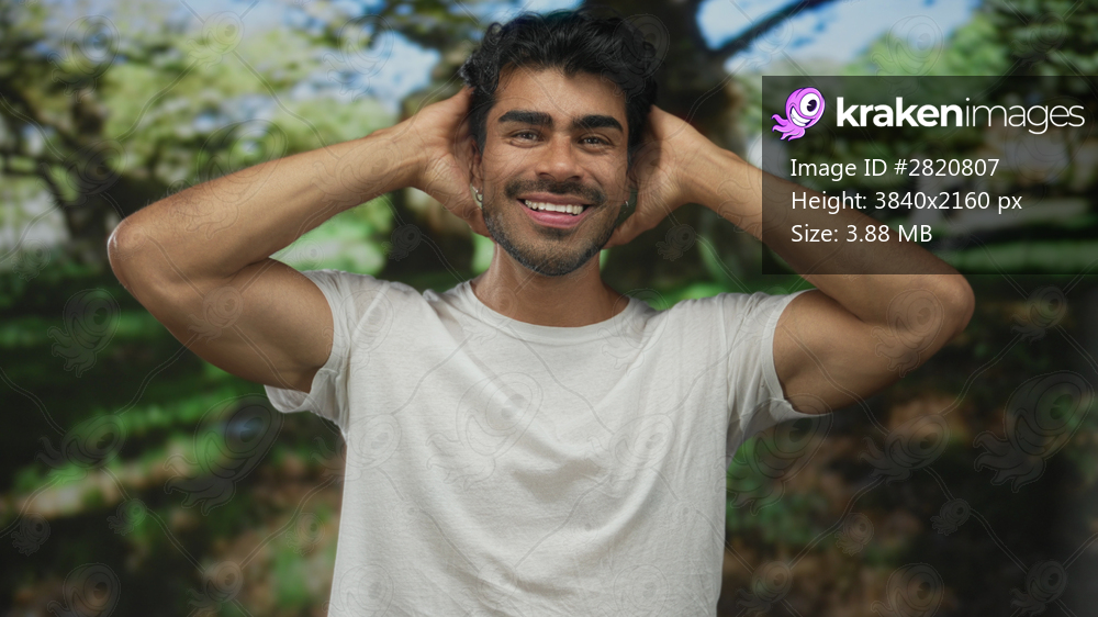 Man in white t shirt holds head with hands on head in forest park while smiling broadly under dappled sunlight; serenity.