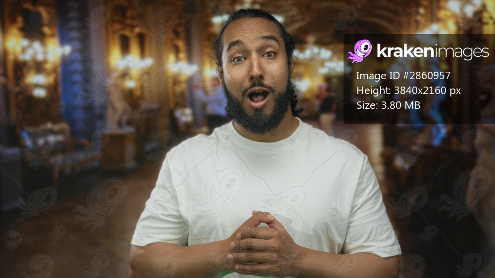 Man in white t shirt looking sideways with pursed lips near marble statues and chandeliers in museum building; curiosity contemplation.