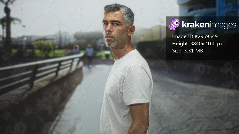 Man in white t-shirt looks at camera on a paved street promenade by a railing and modern building; contemplation.