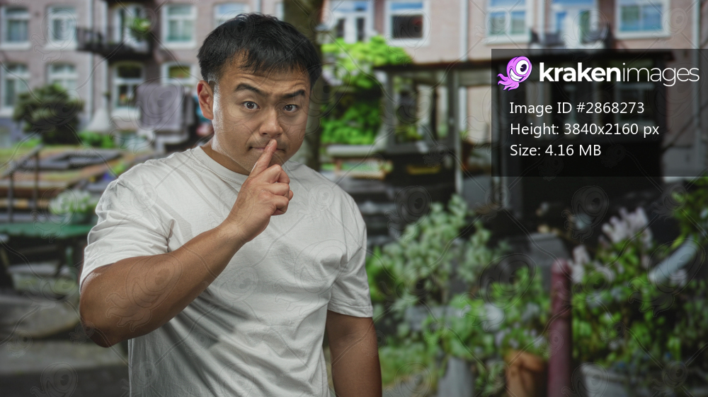 Man in white t shirt making finger to lips for silence on an urban street with brick facades and potted plants; secrecy.
