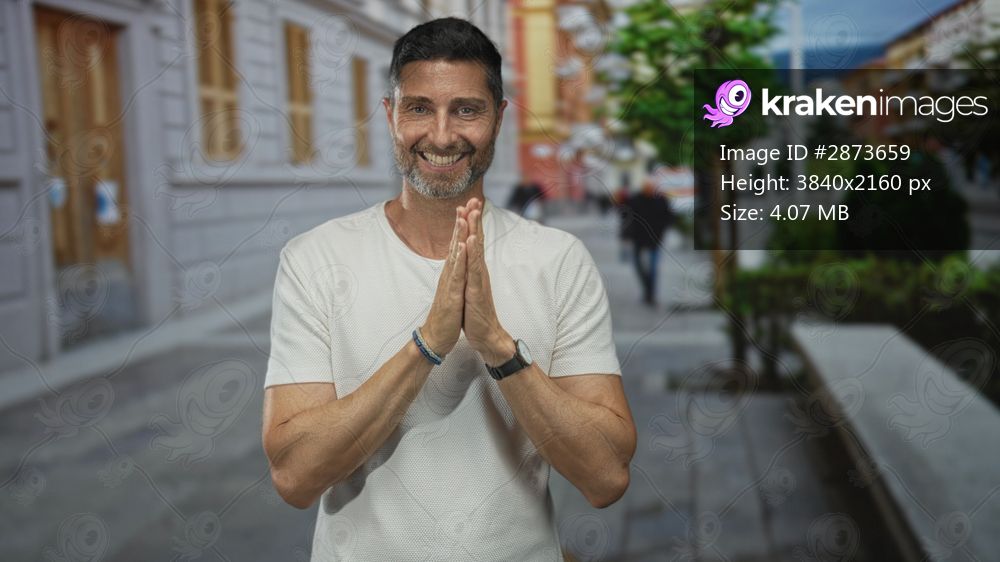 Man in white t shirt on a city street, hands pressed together in a prayerlike gesture near chest while smiling and showing bracelet and watch; gratitude hope. - Kraken Images
