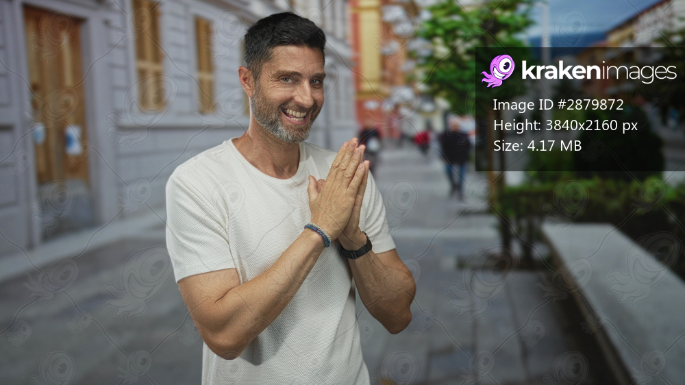 Man in white t shirt on a city street, hands pressed together in a prayerlike gesture near chest while smiling and showing bracelet and watch; gratitude hope. - Kraken Images