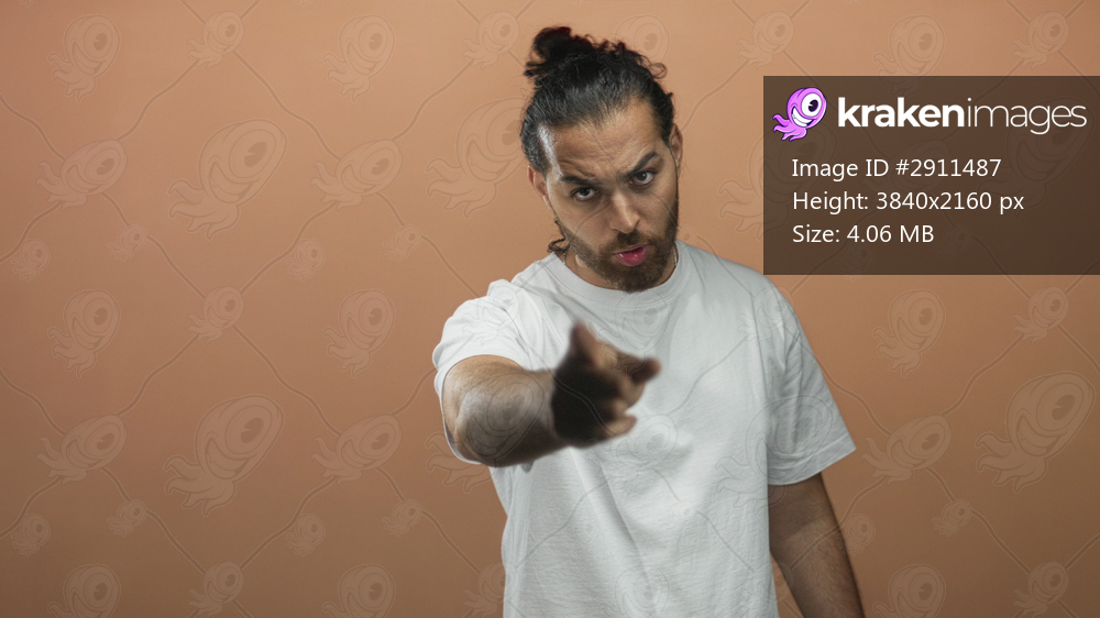 Man in white t shirt pointing finger at camera with stern expression in studio against peach wall; accusation anger.
