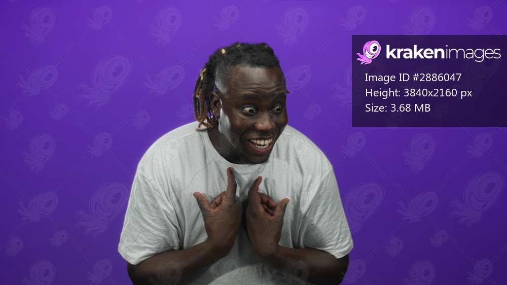 Man in white t shirt pointing thumbs to chest and laughing while clapping hands in purple studio; joy confidence.