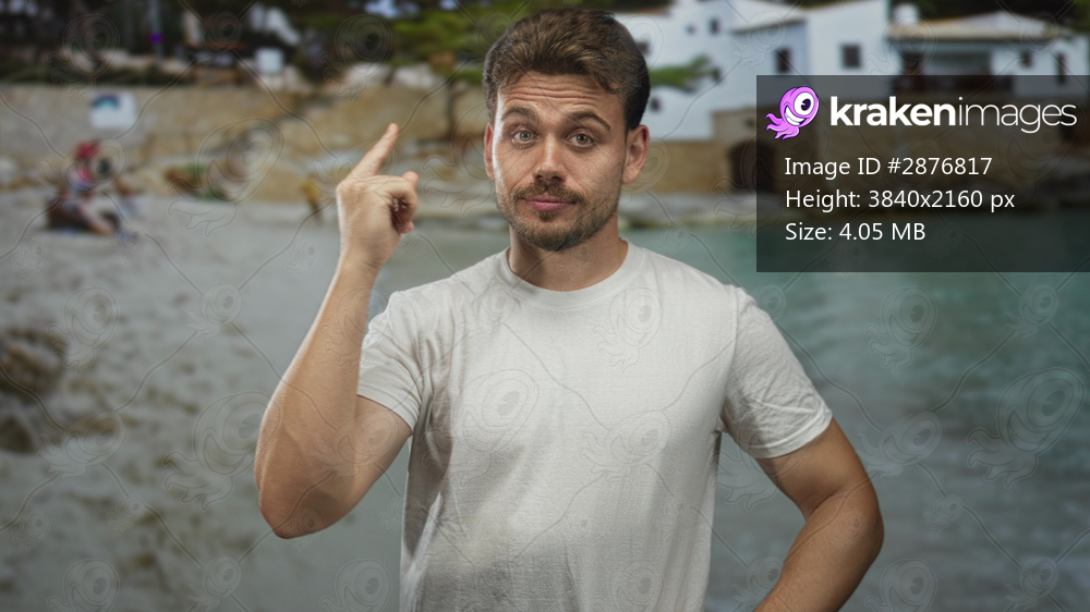 Man in white t shirt points index finger upward at camera on a rocky beach in front of building; confidence instruction.