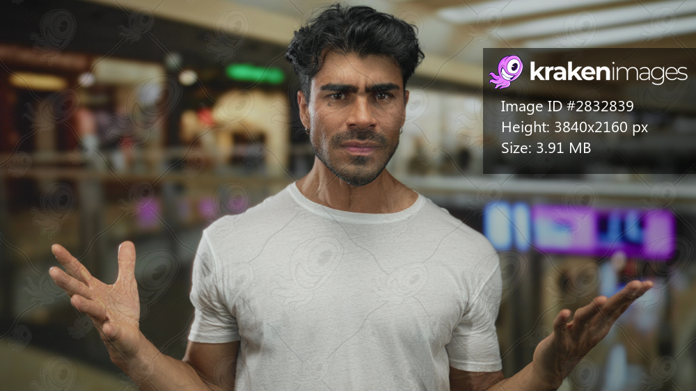 Man in white t shirt with raised hands by blurred storefronts and glass railing in mall center; confusion.