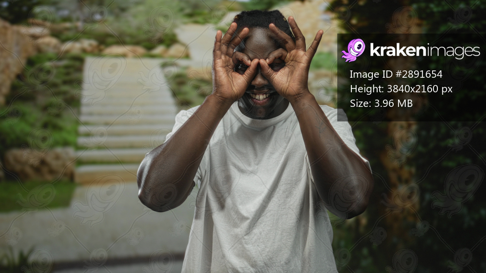 Man in white t shirt smiles and makes hand binoculars over eyes on outdoor stone steps in forest; playful joy.