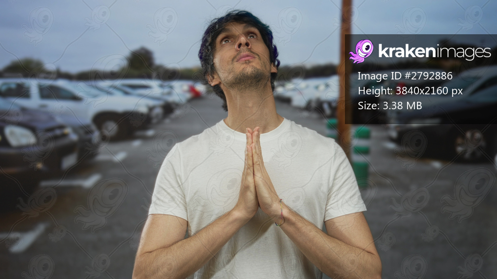 Man in white t shirt stands with pressed hands in prayer on street amid rows of parked vehicles under cloudy sky; hope.