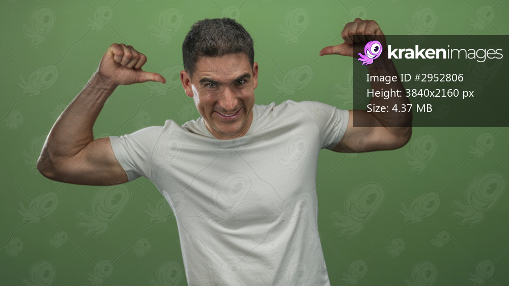 Man in white t shirt thumbs pointing to chest showing biceps and flexing in green studio; confidence pride.