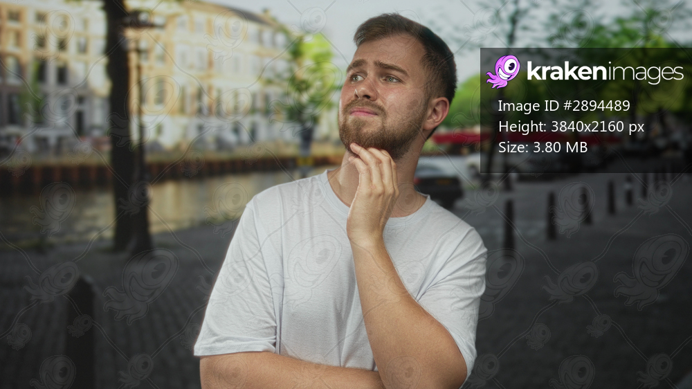 Man in white t shirt touching chin and scratching beard on amsterdam street beside a canal and parked cars; pensive doubt.