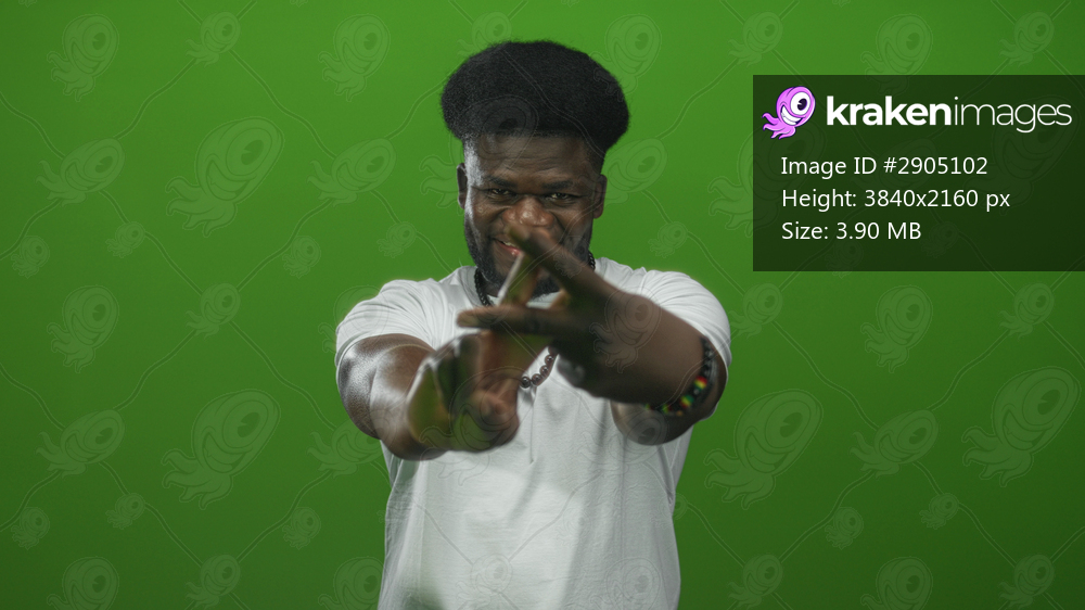 Man in white t shirt wearing beaded bracelet smiling and forming a hashtag with fingers in studio; confidence energy.