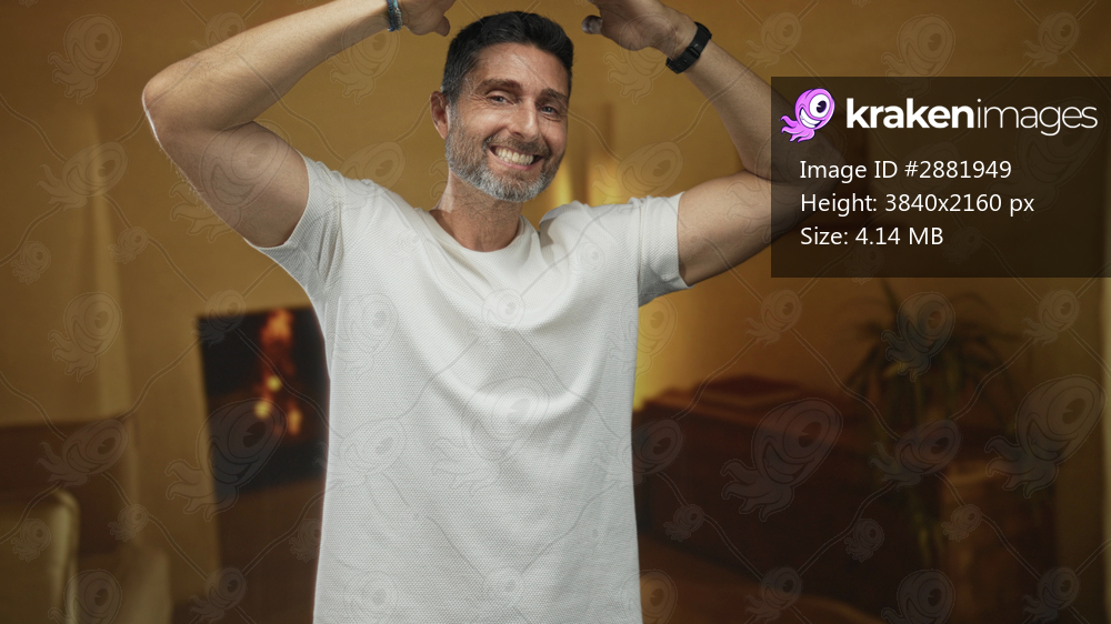 Man in white tee smiling with hands above head in living room near fireplace and plant; home comfort joy.