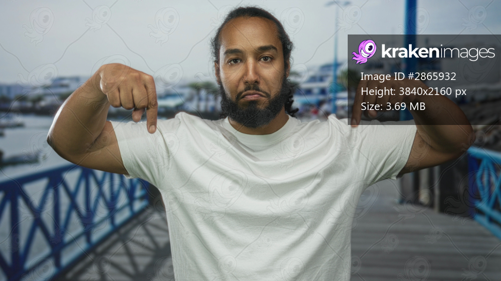 Man in white tshirt with beard points both forefingers down on street promenade by the seaside; attention confidence.