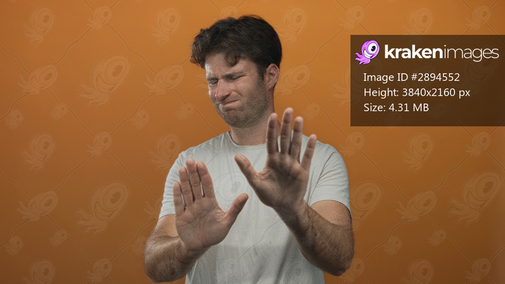 Man in white tshirt holding both palms out stop gesture in orange studio; rejection boundaries caution.