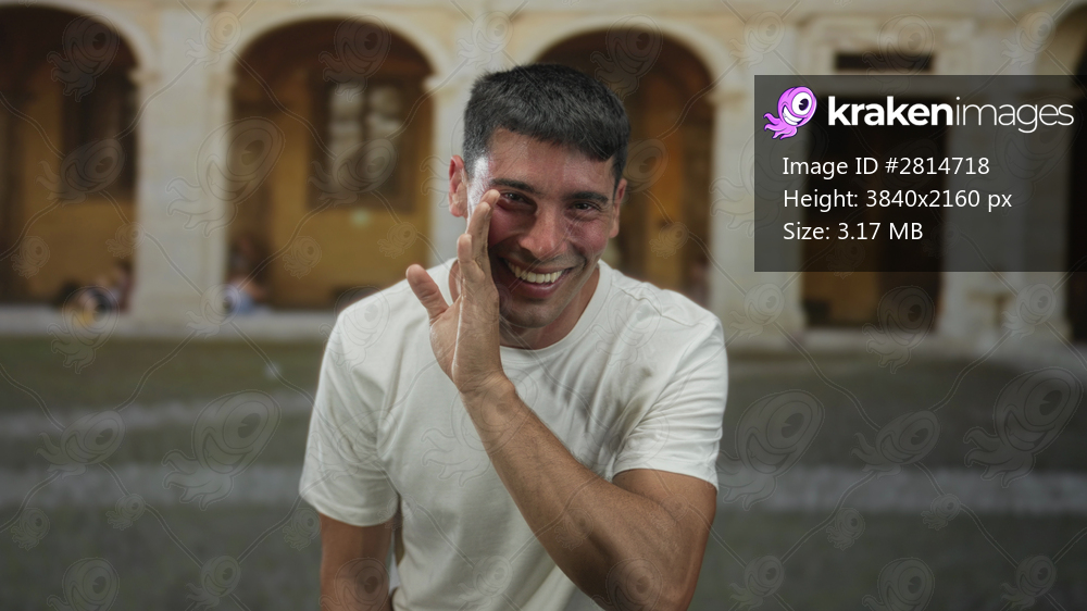 Man in white tshirt holds hand to mouth for whispering gesture in old town street with stone arches and cobblestone paving; secrecy.