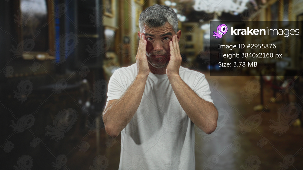 Man in white tshirt pressing hands to face and closing eyes in ornate building corridor lined with paintings and chandeliers; fatigue reflection.